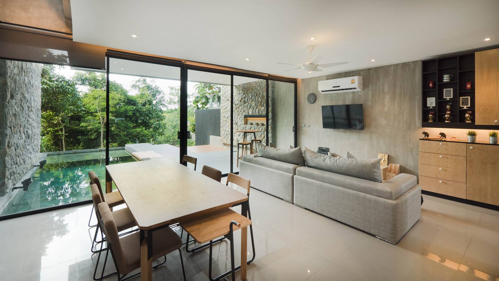 Villa’s design inspiration was taken from back to basic concept, inspired by grey, black, cement base and wood color. Also use of unique lava stone tiles which create a deep emerald green coloring for the pool.