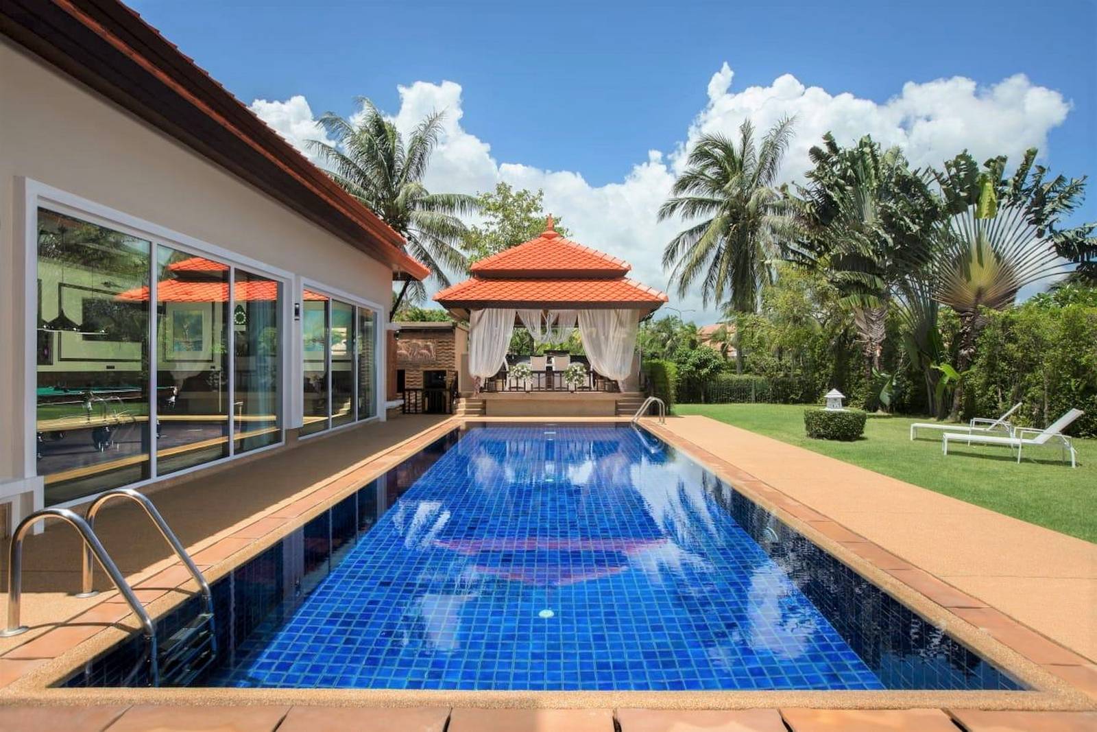The billiard room is built on 85 sqm in the yard with en-suit bathroom, decorated with a valuable teak tree, paintings, a large TV, two chic fully automated aquariums with 2.5 tons of sea water, rare corals and fish. The billiard room, can easily be converted into another guest bedroom suite.